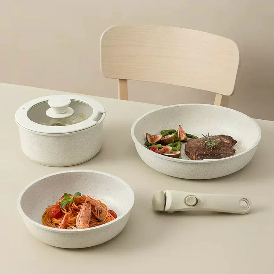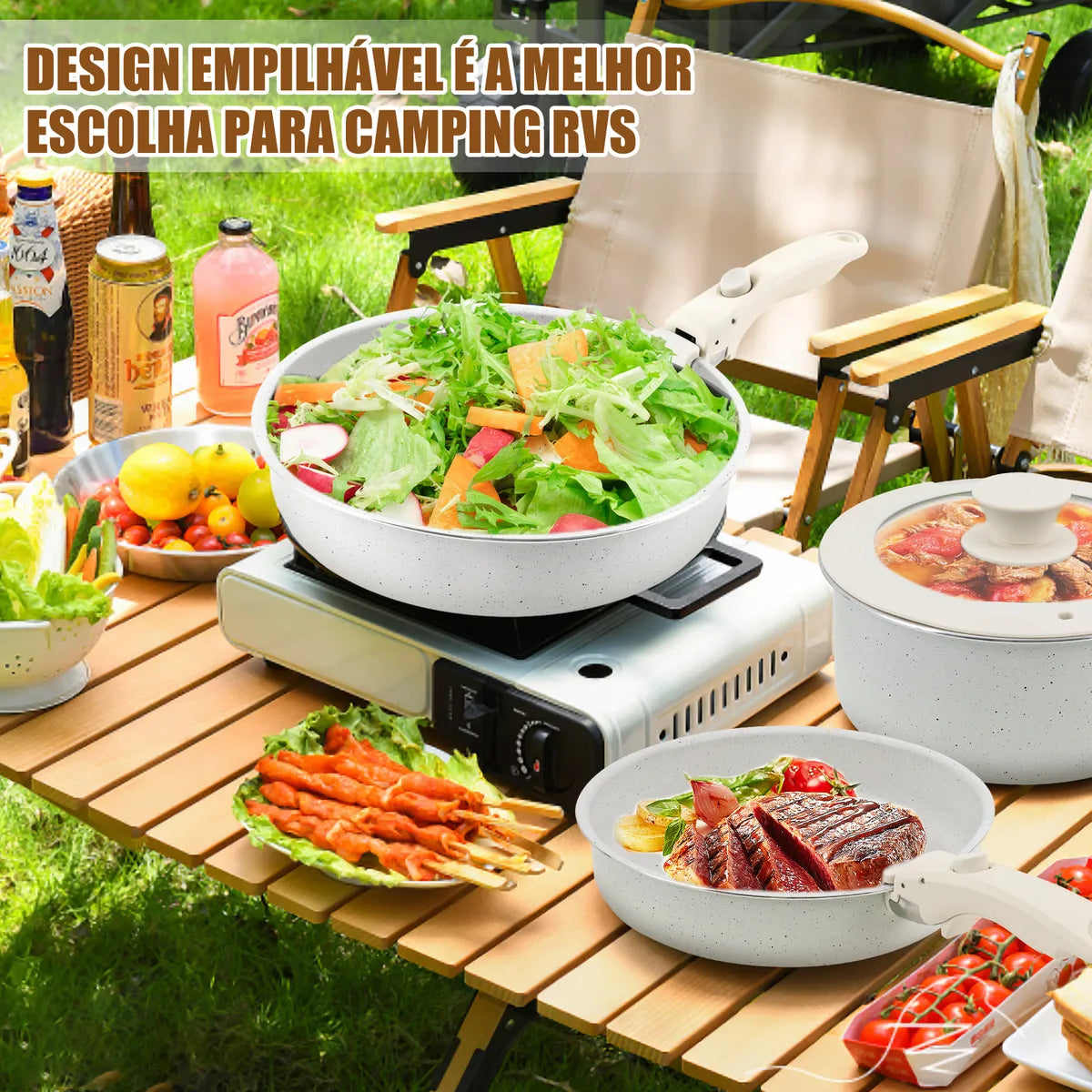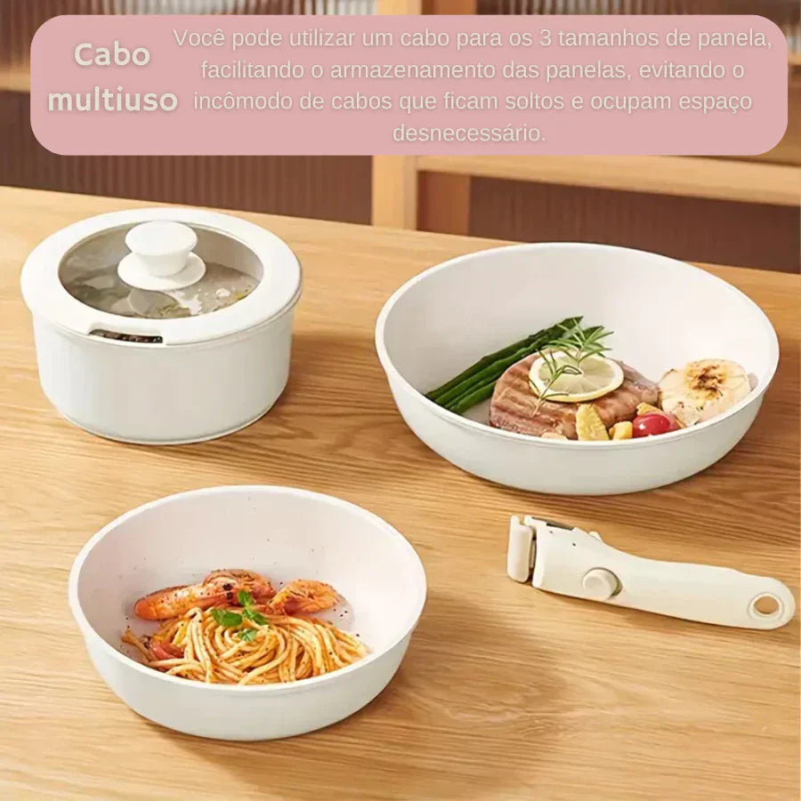 ✅ Versatilidade que você sente na rotina: Sirva, cozinhe, leve ao forno ou guarde na geladeira — tudo isso com o mesmo conjunto, graças ao cabo removível que se encaixa em todas as peças com apenas um clique.